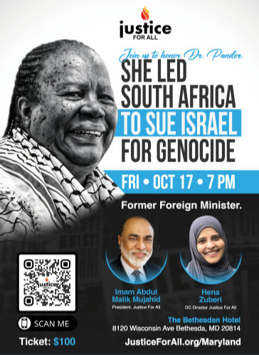 Our keynote speaker for this evening is none other than Her Excellency Dr. Naledi Pandor, the Foreign Minister of South Africa who bravely filed the lawsuit in the International Court of Justice against the Palestine occupation. We would be blessed to have you attend this program as we honor Her Excellency Dr. Pandor in recognition of this courageous action by the nation of South Africa against the illegal, tyrannical regime occupying Palestine.