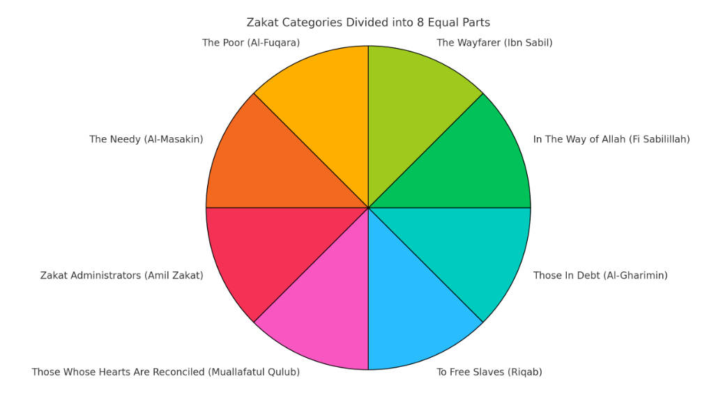 إِنَّمَا ٱلصَّدَقَـٰتُ لِلْفُقَرَآءِ وَٱلْمَسَـٰكِينِ وَٱلْعَـٰمِلِينَ عَلَيْهَا وَٱلْمُؤَلَّفَةِ قُلُوبُهُمْ وَفِى ٱلرِّقَابِ وَٱلْغَـٰرِمِينَ وَفِى سَبِيلِ ٱللَّهِ وَٱبْنِ ٱلسَّبِيلِ ۖ فَرِيضَةًۭ مِّنَ ٱللَّهِ ۗ وَٱللَّهُ عَلِيمٌ حَكِيمٌۭ